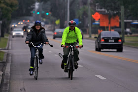 Another example, last night on the UCF ride we were riding down Lockwood single file in the bike lane or shoulder or whatever it is there and this huge pickup truck pulled up directly in front of us and turned right in front of us. We had to all jam on our brakes and barely avoided a collision. Drivers just don't view us, relegated to the side of the road, as in the road -- I think they just assume that we're going slow and will stop / yield to them as if we are pedestrians.